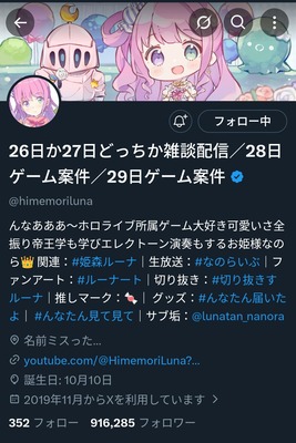 【ホロライブ】Xから姫森ルーナさんの名前が消える