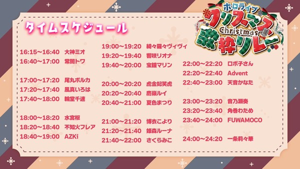 【ホロライブ】クリスマス歌枠リレー2025のタイムスケジュール公開 今年のトリはりりか社長