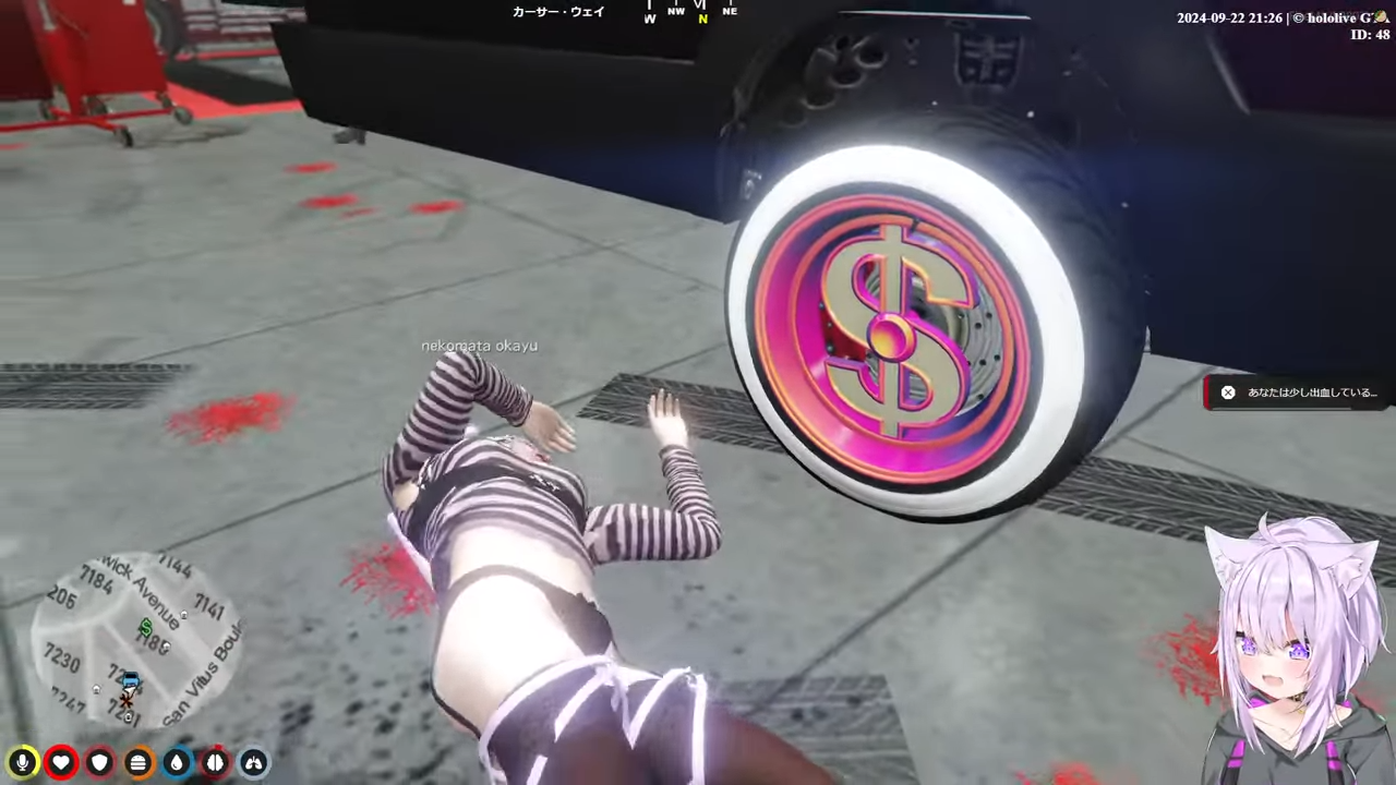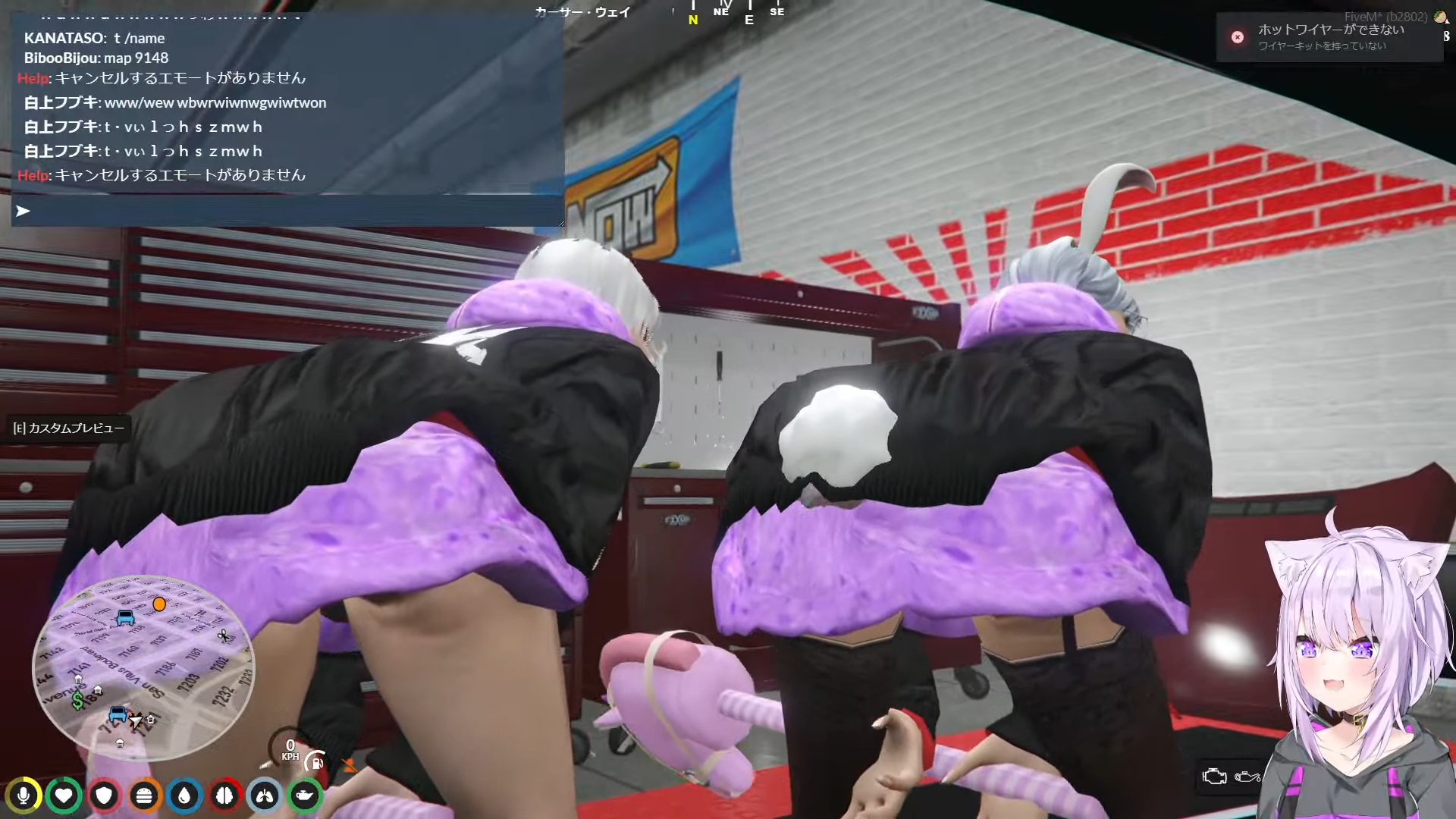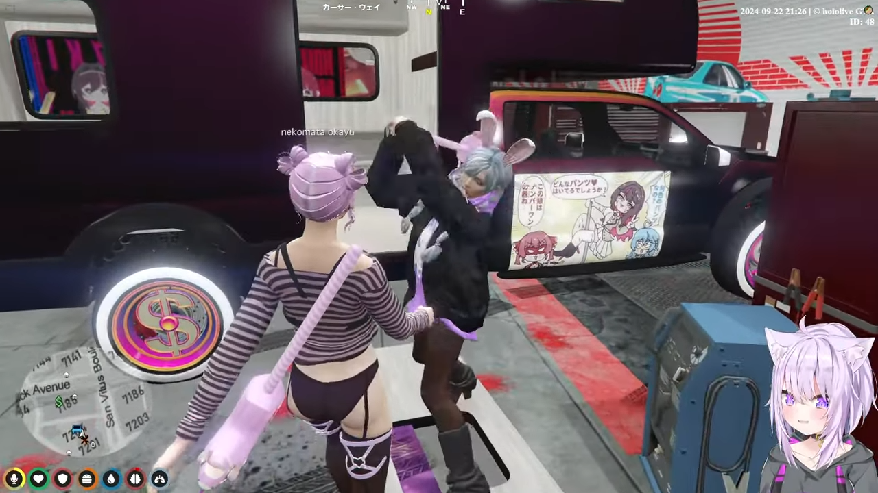 自分の車の修理中に暇でウロウロしてたらマリン車を発見し、マリン車にあったあずきち含めた3人組の絵を見て、ユニコーンで殴ろうとしていた(ユニコーンは確率を引かない限りはかなり弱武器)。