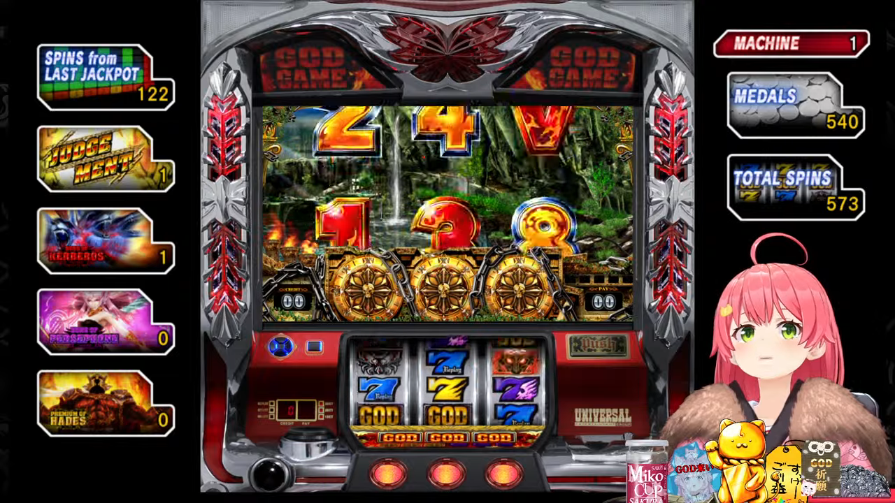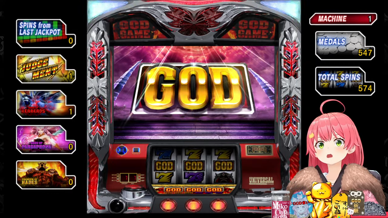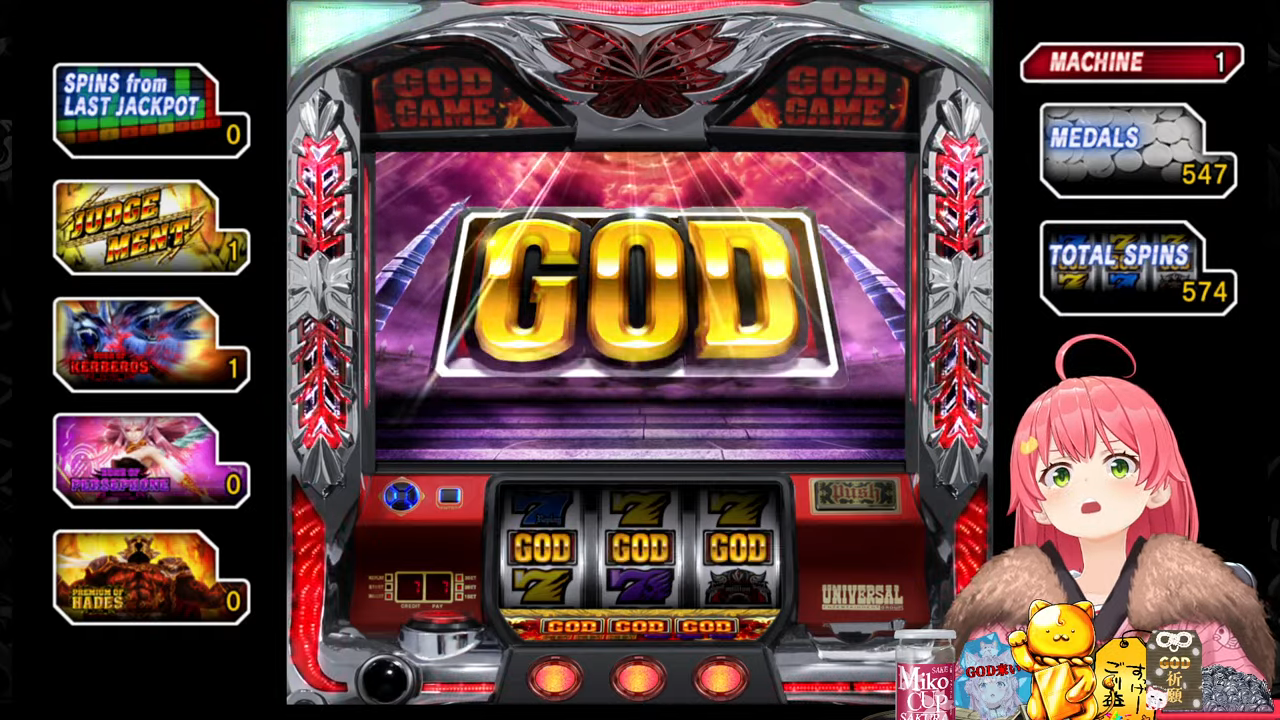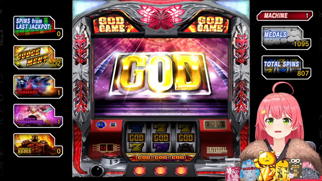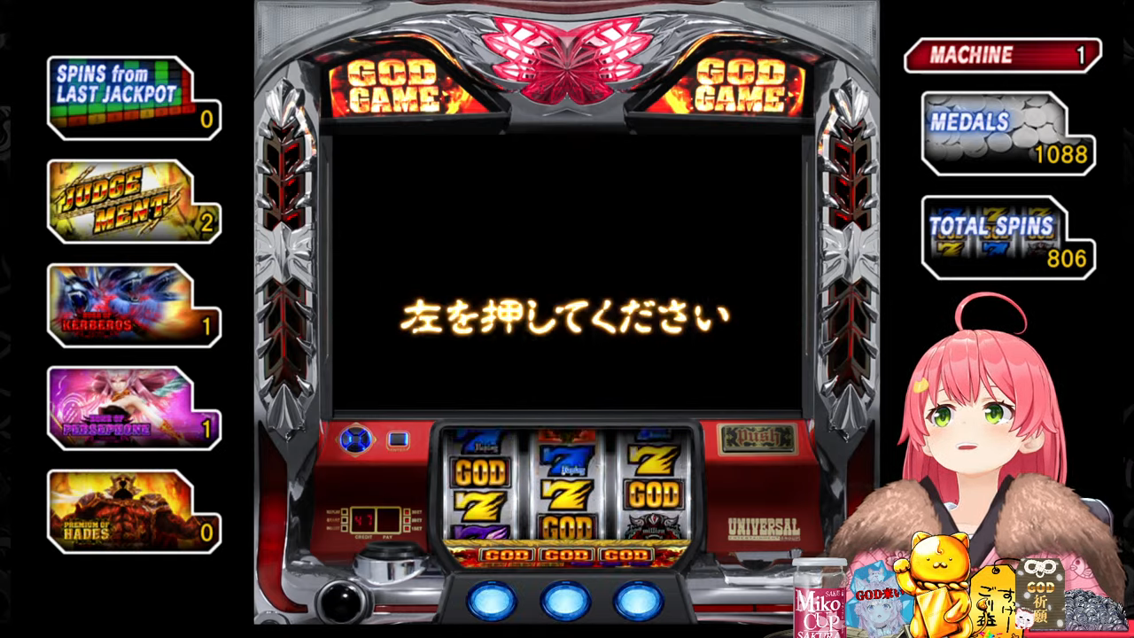 管理人ちゃん:ちなみにプチュンからのGOD揃いは4号機の初代ミリオンゴッドから受け継がれている伝統の演出で、今回打ってる5号機ミリゴの「左を押してください」は単なる演出上のものでどこから押しても問題無いのでみこちでも安心して打てるんですが、初代ミリゴのGOD揃いは指示の通り左から押さないとペナルティでコイン5000枚=10万円分の当たりの権利が消滅していました。