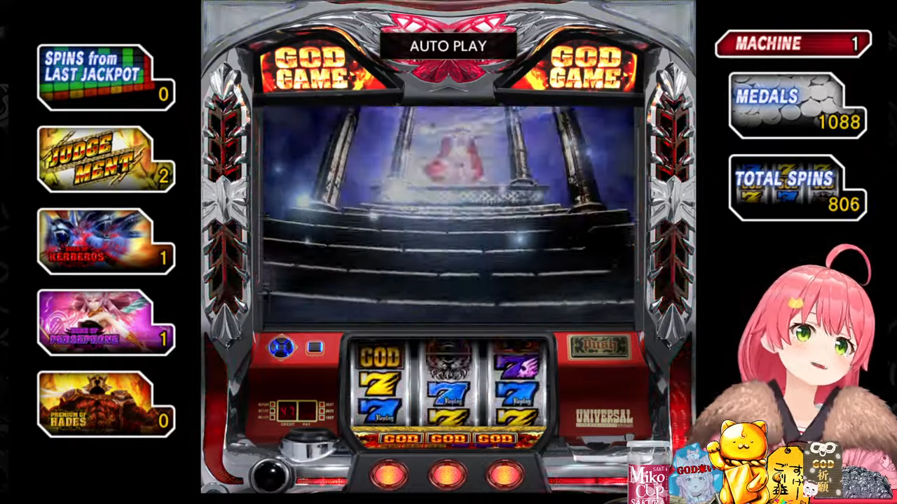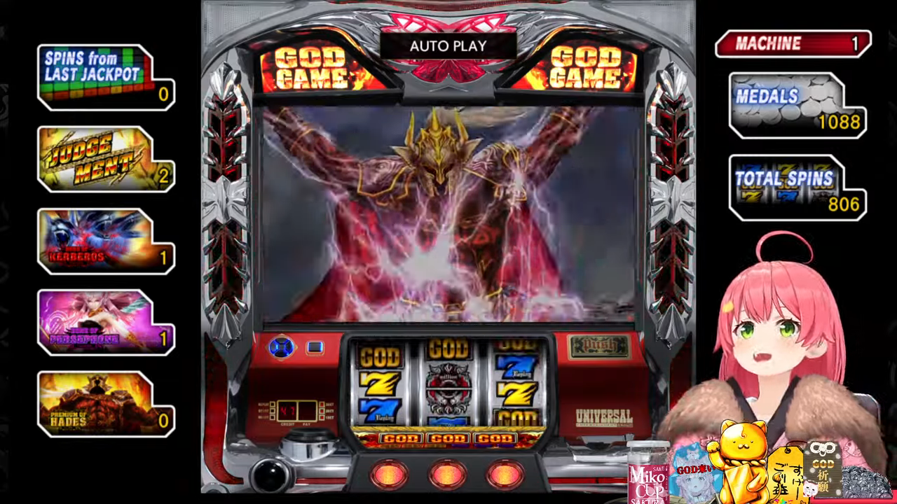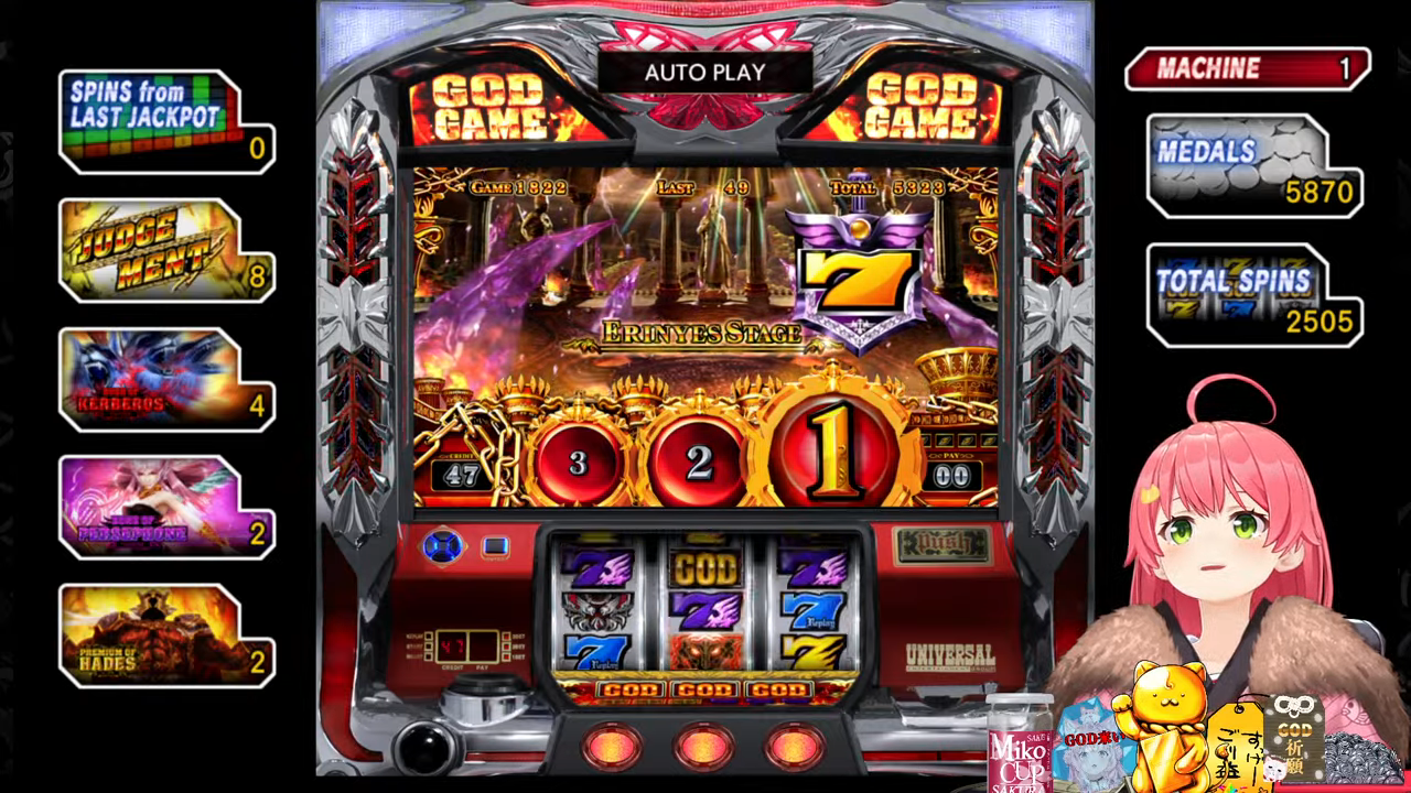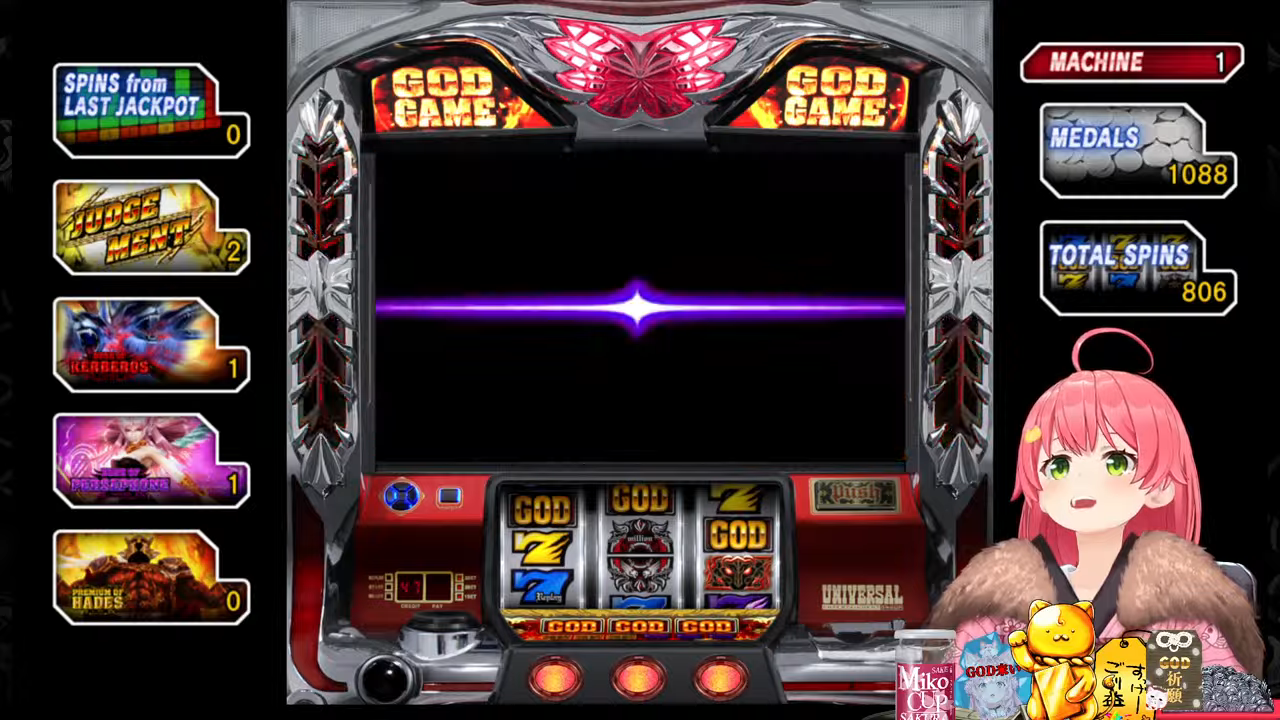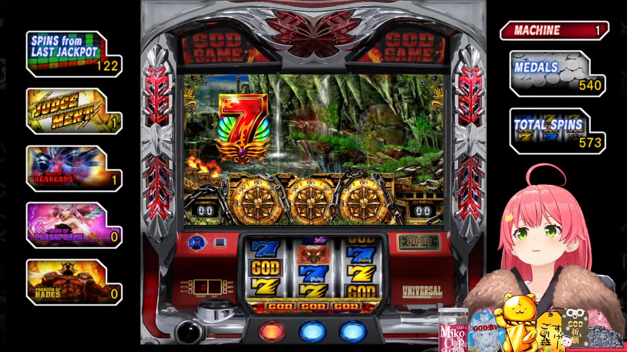 管理人ちゃん:ちなみにプチュンからのGOD揃いは4号機の初代ミリオンゴッドから受け継がれている伝統の演出で、今回打ってる5号機ミリゴの「左を押してください」は単なる演出上のものでどこから押しても問題無いのでみこちでも安心して打てるんですが、初代ミリゴのGOD揃いは指示の通り左から押さないとペナルティでコイン5000枚=10万円分の当たりの権利が消滅していました。