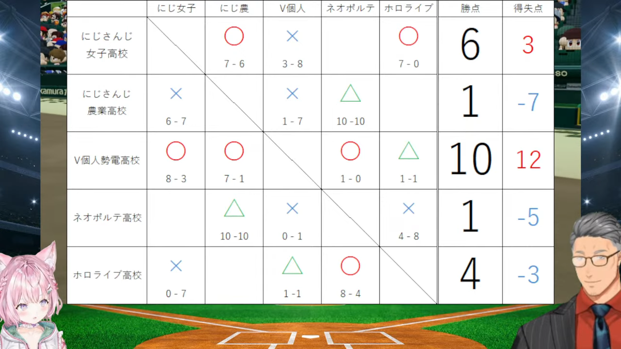 管理人ちゃん:勝ち点が同じ場合は得失点差での順位付けになるため、本日のにじ女vsネオポルテでにじ女が勝利した場合ホロ高は4位に。