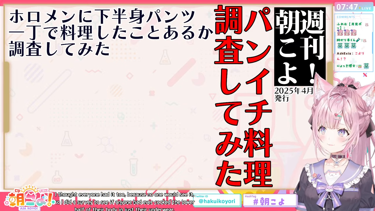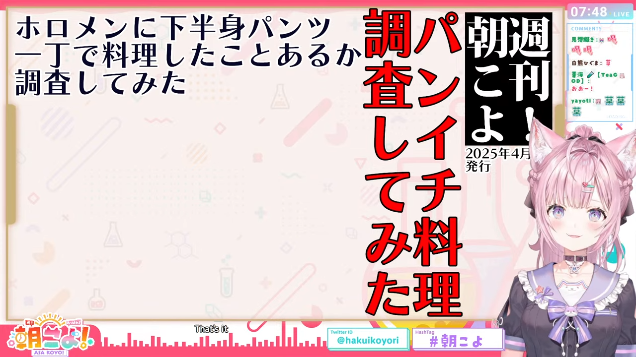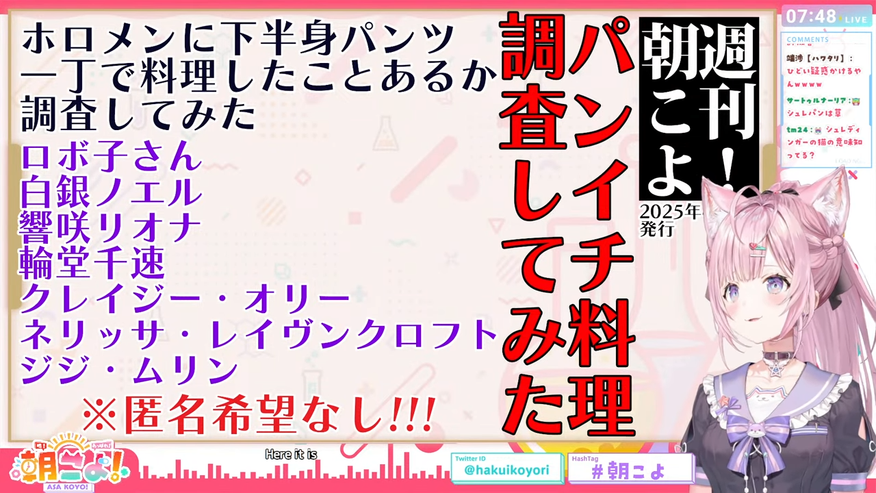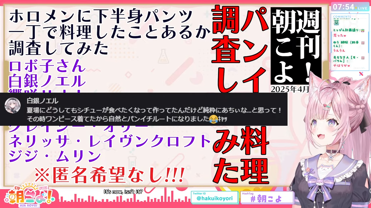 管理人ちゃん:なお紹介されたのはあくまでも「朝こよまでに回答があったメンバー」であって、回答していないメンバーにパンイチ料理経験があるかないかはあくまで未確定(こより談)ということにもご留意ください。
