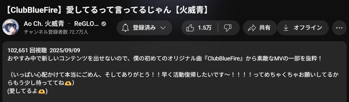 だから活動休止当日の配信も「本当に病んでるのか?」ってくらいいつも通りだったし、たぶん痩せ我慢してたんじゃなくて本当に配信は平然とできる精神状態だったんだと思う。他のホロメンが口を揃えて「青くん元気にやってるよ」って言ってるのもそう。