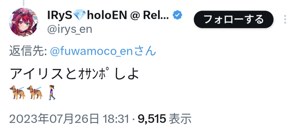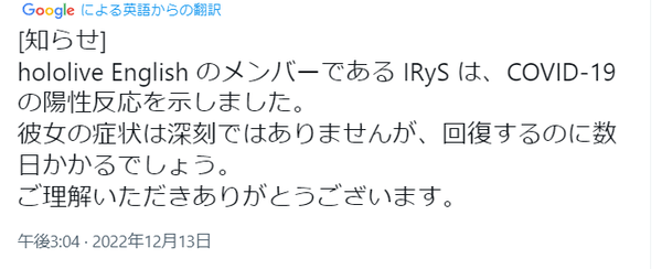 ホロEN公式よりIRySコロナ陽性とのお知らせ…症状は深刻では無いとのこと